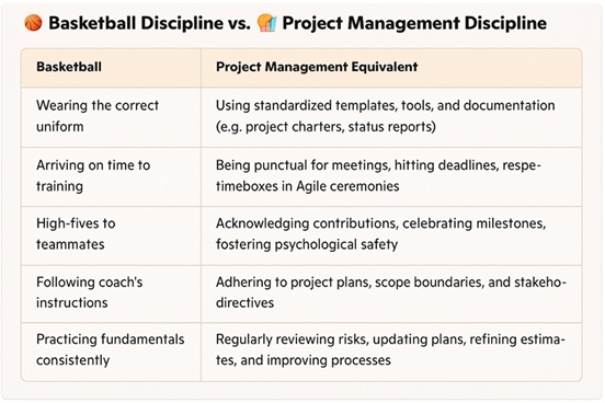 The table below shows how everyday basketball disciplines—like wearing the right uniform, arriving on time, or high-fiving teammates—translate directly into equivalent practices in project management.