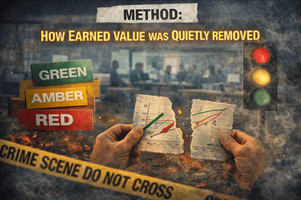 The method was subtler than outright rejection, with Earned Value quietly displaced by softer, narrative-friendly indicators that favoured storytelling over measurement.